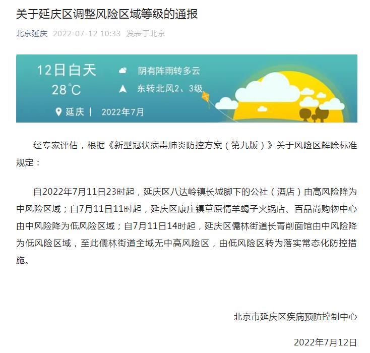 中新網(wǎng)7月12日電 據(jù)“北京延慶”微信公眾號消息,北京市延慶區(qū)疾病預防控制中心12日發(fā)布通報稱,經(jīng)專家評估,根據(jù)《新型冠狀病毒肺炎防控方案(第九版)》關于風險區(qū)解除標準規(guī)定:自2022年7月11日23時起,延慶區(qū)八達嶺鎮(zhèn)長城腳下的公社(酒店)由高風險降為中風險區(qū)域;自7月11日11時起,延慶區(qū)康莊鎮(zhèn)草原情羊蝎子火鍋店、百品尚購物中心由中風險降為低風險區(qū)域;自7月11日14時起,延慶區(qū)儒林街道長青削面館由中風險降為低風險區(qū)域,至此儒林街道全域無中高風險區(qū),由低風險區(qū)轉(zhuǎn)為落實常態(tài)化防控措施。