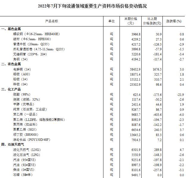 中新網(wǎng)8月4日電 國(guó)家統(tǒng)計(jì)局4日公布2022年7月下旬流通領(lǐng)域重要生產(chǎn)資料市場(chǎng)價(jià)格變動(dòng)情況,據(jù)對(duì)全國(guó)流通領(lǐng)域9大類(lèi)50種重要生產(chǎn)資料市場(chǎng)價(jià)格的監(jiān)測(cè)顯示,2022年7月下旬與7月中旬相比,15種產(chǎn)品價(jià)格上漲,32種下降,3種持平。