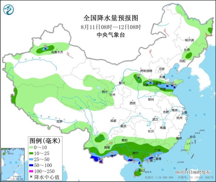 8月11日08時至12日08時,云南南部、廣西南部、廣東西南部沿海以及山西中部、河北南部、山東中部等地部分地區(qū)有大到暴雨,其中,云南南部局地有大暴雨(100~120毫米)。內(nèi)蒙古中東部、新疆東部、云南中南部、廣西南部、廣東西南部沿海、海南島西部等地部分地區(qū)有4~6級風,局地風力可達6~7級。