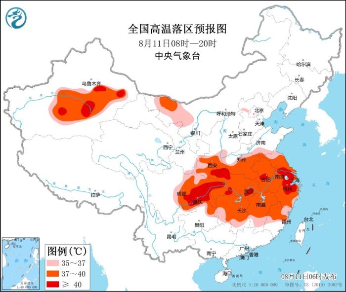 預計8月11日白天,新疆南疆盆地、內(nèi)蒙古西部、陜西中南部、河南中南部、安徽、江蘇、上海、四川中東部、重慶、湖北、湖南、江西、浙江、福建中北部、貴州北部等地有35~39℃高溫天氣,其中,陜西東南部、湖北西部和南部、四川東部、重慶、江蘇南部、安徽中部、浙江北部等地的部分地區(qū)可達40℃以上。中央氣象臺8月11日06時繼續(xù)發(fā)布高溫橙色預警。