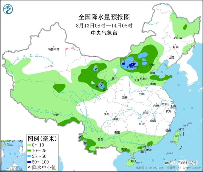 8月13日08時至14日08時,內(nèi)蒙古中西部和東南部、西藏東南部、甘肅中部、青海東北部、華北中北部、山東北部、云南南部等地部分地區(qū)有中到大雨,其中,內(nèi)蒙古河套地區(qū)等地局地有暴雨(50~90毫米)。新疆東部和南疆盆地部分地區(qū)有4~6級風。