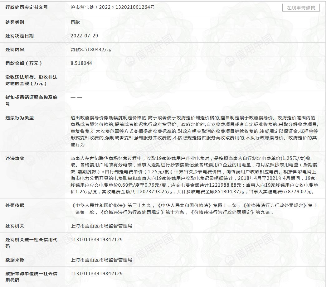 世紀聯(lián)華加價收取電費被罰8.5萬
