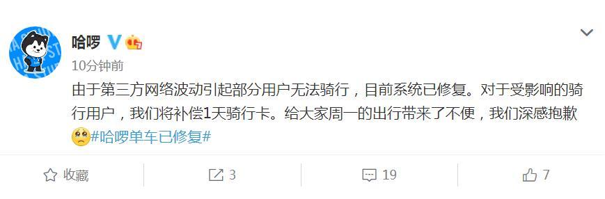 哈啰回應單車崩了:系統(tǒng)已修復 補償1天騎行卡