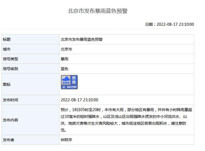 - 北京發(fā)布暴雨藍(lán)色預(yù)警:大雨,部分地區(qū)暴雨