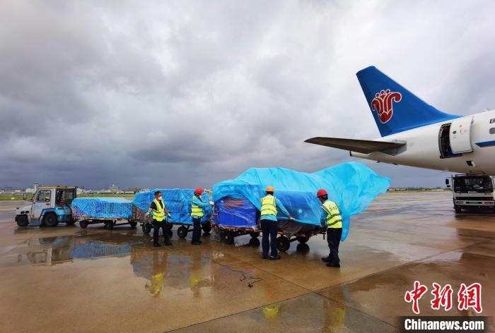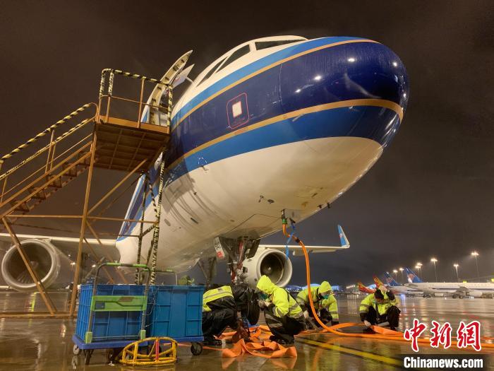 南航機務人員完成所有停場飛機前起落架與主起落架系留。 南航供圖
