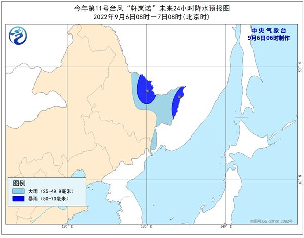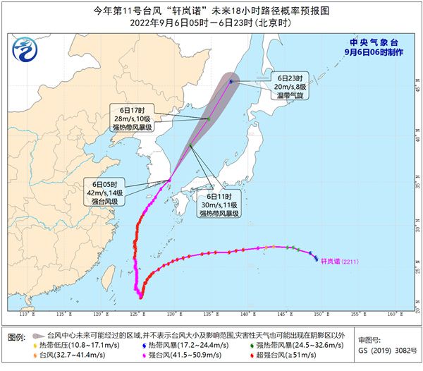 大風(fēng)預(yù)報:9月6日08時至7日08時,東海東北部、黃海中東部和東南部有6-7級大風(fēng),陣風(fēng)8-9級;我國東北地區(qū)東北部有4-5級風(fēng),陣風(fēng)6-7級,局地8級。朝鮮海峽、日本海大部有8-11級大風(fēng),“軒嵐諾”中心經(jīng)過的附近海面的風(fēng)力有12-14級,陣風(fēng)可達(dá)15-16級。