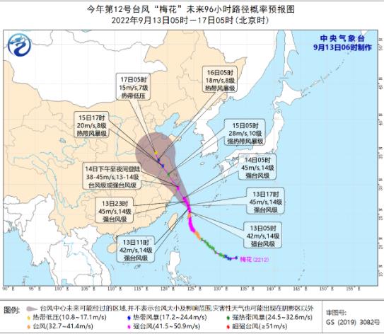 大風預報:9月13日8時至14日8時,巴士海峽、臺灣海峽北部、臺灣以東洋面、黃海西南部海域、東海大部及釣魚島附近海域、長江口區(qū)、杭州灣以及臺灣島北部和東部沿海、浙江沿海、福建北部沿海、上海沿海、江蘇東南部沿海將有6-8級大風,陣風9-11級,其中東海部分海域?qū)⒂?-11級大風,陣風12-14級,“梅花”中心經(jīng)過的附近海面的風力有12-14級,陣風可達15-16級。