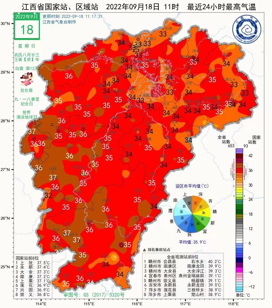 記者從江西省氣象臺(tái)和省突發(fā)事件預(yù)警信息發(fā)布中心獲悉,9月18日江西省有1159個(gè)氣象監(jiān)測(cè)站最高氣溫超35℃,90個(gè)氣象監(jiān)測(cè)站最高氣溫超38℃,覆蓋全省11個(gè)地市。
