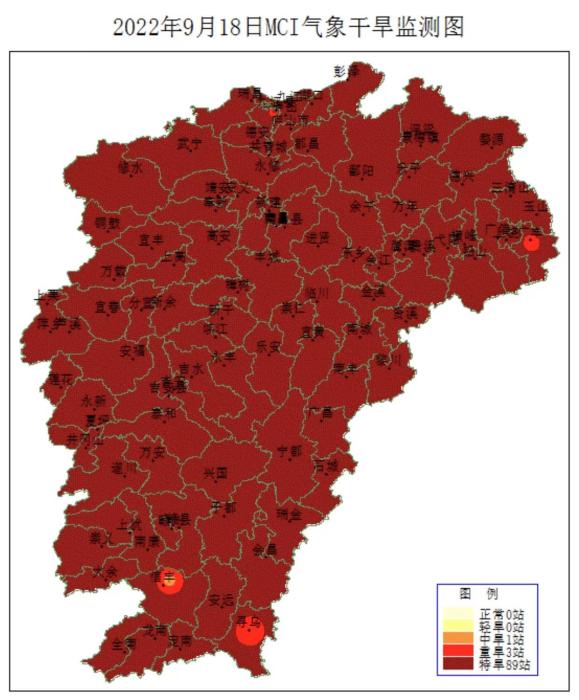 今天(19日),江西高溫持續(xù),由于無有效降雨,全省95.7%的縣(市、區(qū))出現(xiàn)特重氣象干旱。7月12日江西局部開始出現(xiàn)重度氣象干旱以來至今已持續(xù)69天,森林火險(xiǎn)氣象等級(jí)4(高)至5級(jí)(極高)。