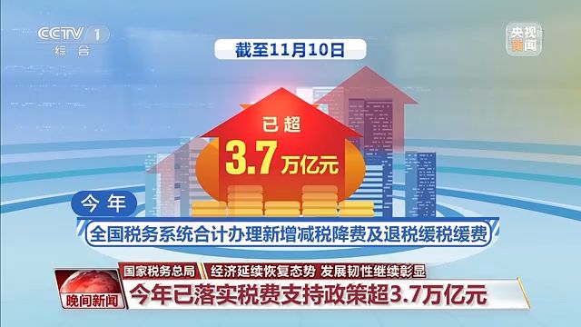 國家稅務(wù)總局今天公布最新數(shù)據(jù),截至11月10日,今年全國稅務(wù)系統(tǒng)合計(jì)辦理新增減稅降費(fèi)及退稅緩稅緩費(fèi)已超3.7萬億元,各項(xiàng)稅費(fèi)支持政策有效減輕了企業(yè)負(fù)擔(dān),增強(qiáng)了企業(yè)發(fā)展動能。