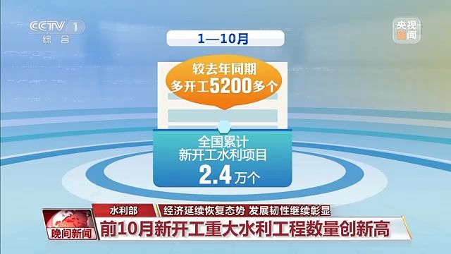 水利部今天發(fā)布數(shù)據(jù)顯示:1—10月,全國累計(jì)新開工水利項(xiàng)目2.4萬個(gè),較去年同期多開工5200多個(gè),其中新開工重大水利工程45項(xiàng),創(chuàng)歷史新高。
