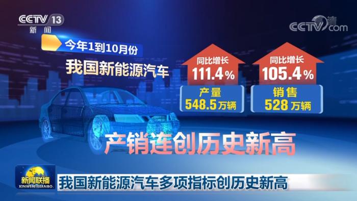 央視網(wǎng)消息(新聞聯(lián)播):今年前十個月,我國新能源汽車產(chǎn)銷量、出口量等多項指標(biāo)創(chuàng)歷史新高。