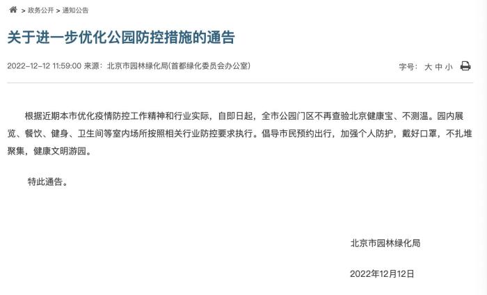 12月12日,北京市園林綠化局發(fā)布關于進一步優(yōu)化公園防控措施的通告。