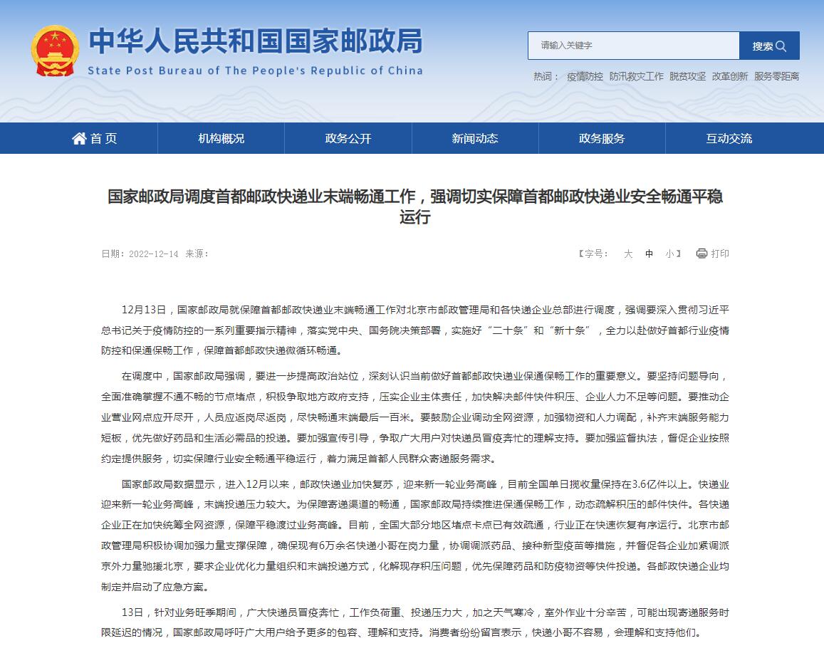 國(guó)家郵政局?jǐn)?shù)據(jù)顯示,進(jìn)入12月以來,郵政快遞業(yè)加快復(fù)蘇,迎來新一輪業(yè)務(wù)高峰,目前全國(guó)單日攬收量保持在3.6億件以上。快遞業(yè)迎來新一輪業(yè)務(wù)高峰,末端投遞壓力較大。為保障寄遞渠道的暢通,國(guó)家郵政局持續(xù)推進(jìn)保通保暢工作,動(dòng)態(tài)疏解積壓的郵件快件。各快遞企業(yè)正在加快統(tǒng)籌全網(wǎng)資源,保障平穩(wěn)渡過業(yè)務(wù)高峰。目前,全國(guó)大部分地區(qū)堵點(diǎn)卡點(diǎn)已有效疏通,行業(yè)正在快速恢復(fù)有序運(yùn)行。北京市郵政管理局積極協(xié)調(diào)加強(qiáng)力量支撐保障,確保現(xiàn)有6萬余名快遞小哥在崗力量,協(xié)調(diào)調(diào)派藥品、接種新型疫苗等措施,并督促各企業(yè)加緊調(diào)派京外力量馳援北京,要求企業(yè)優(yōu)化力量組織和末端投遞方式,化解現(xiàn)存積壓?jiǎn)栴},優(yōu)先保障藥品和防疫物資等快件投遞。各郵政快遞企業(yè)均制定并啟動(dòng)了應(yīng)急方案。