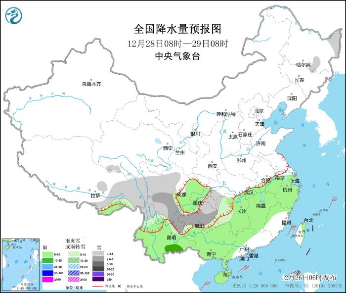 26日夜間至29日,西南地區(qū)、江南、華南等地將出現(xiàn)一次雨雪天氣過程,其中,西藏東南部、云南北部、川西高原、重慶東南部、貴州、湖南西部和北部、湖北西部、安徽南部、浙江西北部等地有小到中雪或雨夾雪,貴州中部和東部、湖南西部局地大到暴雪,貴州西部局地有凍雨;四川盆地、云南中南部、湖南南部、江西大部、浙江大部、福建北部以及廣西、廣東北部等地有小雨,局地中雨;主要降水時段為27日至28日。