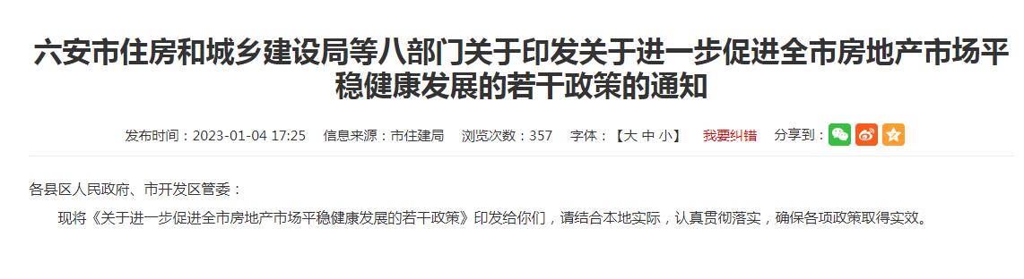 中新網(wǎng)1月5日電 據(jù)安徽省六安市住房和城鄉(xiāng)建設(shè)局網(wǎng)站消息,近日,六安市住房和城鄉(xiāng)建設(shè)局等八部門(mén)印發(fā)《關(guān)于進(jìn)一步促進(jìn)全市房地產(chǎn)市場(chǎng)平穩(wěn)健康發(fā)展的若干政策》。