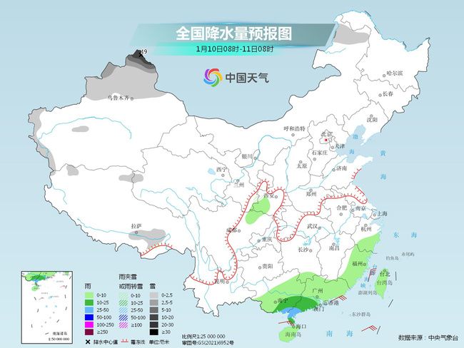 降水方面,今天,我國降水區(qū)域仍集中在一南一北:新疆北部及華南地區(qū),新疆多地有強降雪現(xiàn)身,廣東、廣西的部分地區(qū)或有大雨。具體來看,今天,內(nèi)蒙古東北部、新疆北部和西部山區(qū)等地部分地區(qū)有小到中雪,其中,新疆北疆北部等地部分地區(qū)有大到暴雪(10~19毫米)。江南東南部、華南大部、臺灣島等地部分地區(qū)有小到中雨,其中,廣西東南部沿海、廣東西南部等地部分地區(qū)有大雨。
