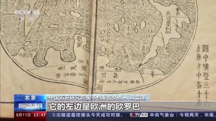中國歷史研究院圖書檔案館負(fù)責(zé)人 袁立澤:這幅圖是16世紀(jì)末,西方第一批來華傳教士利瑪竇主持繪制的。把西方當(dāng)時(shí)先進(jìn)的制圖技術(shù)帶到了中國,同時(shí)他有意識地吸收了中國的制圖經(jīng)驗(yàn)和理念。今天我們所熟悉的七大洲四大洋,在圖中應(yīng)該說已經(jīng)標(biāo)示出了六大洲和三大洋,就是亞洲的亞細(xì)亞。它的左邊是歐洲的歐羅巴,南面就是今天的非洲叫利未亞,改變了以往以歐洲為中心的繪圖方式。它是中西文明交流互鑒的一個(gè)結(jié)晶和有力見證。