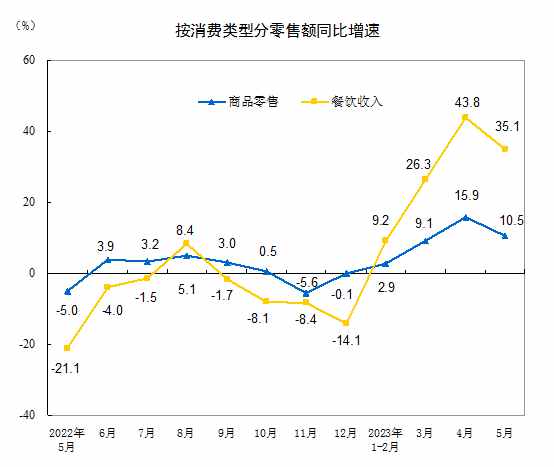 按消費類型分,5月份,商品零售33733億元,同比增長10.5%;餐飲收入4070億元,增長35.1%。1—5月份,商品零售167678億元,同比增長7.9%;餐飲收入19958億元,增長22.6%。