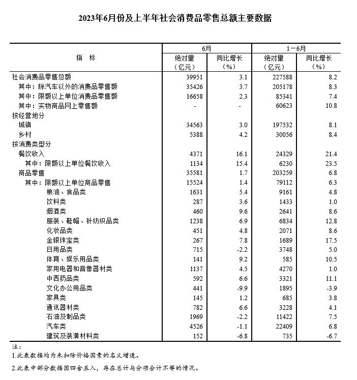 國(guó)家統(tǒng)計(jì)局:2023年上半年社會(huì)消費(fèi)品零售總額增長(zhǎng)8.2%