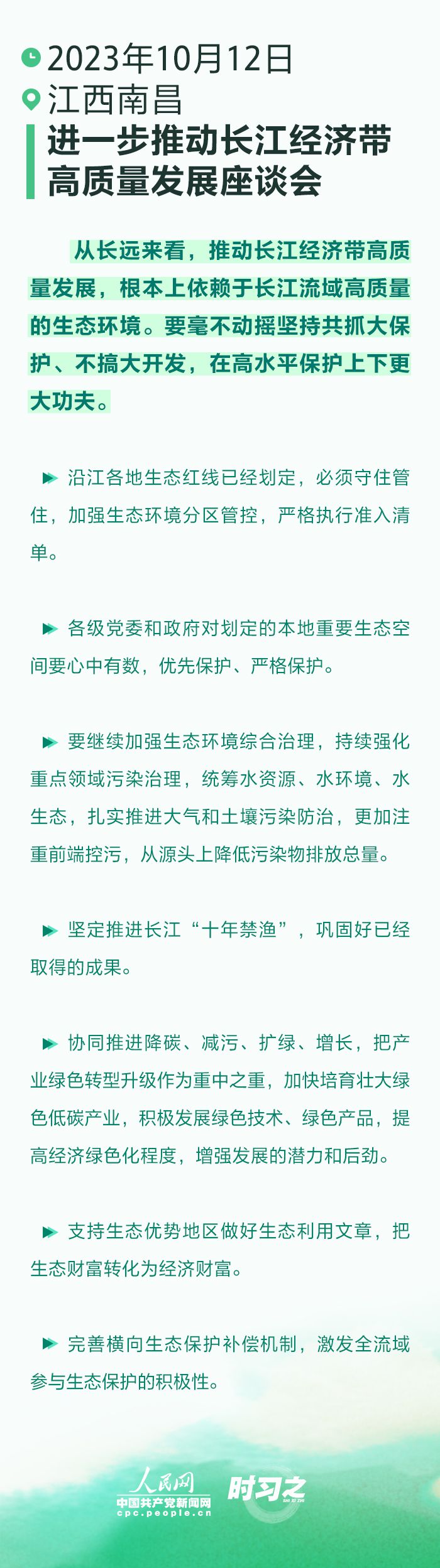 10月12日下午,習近平總書記在江西省南昌市主持召開進一步推動長江經(jīng)濟帶高質量發(fā)展座談會并發(fā)表重要講話。座談會上,總書記指出,從長遠來看,推動長江經(jīng)濟帶高質量發(fā)展,根本上依賴于長江流域高質量的生態(tài)環(huán)境。
