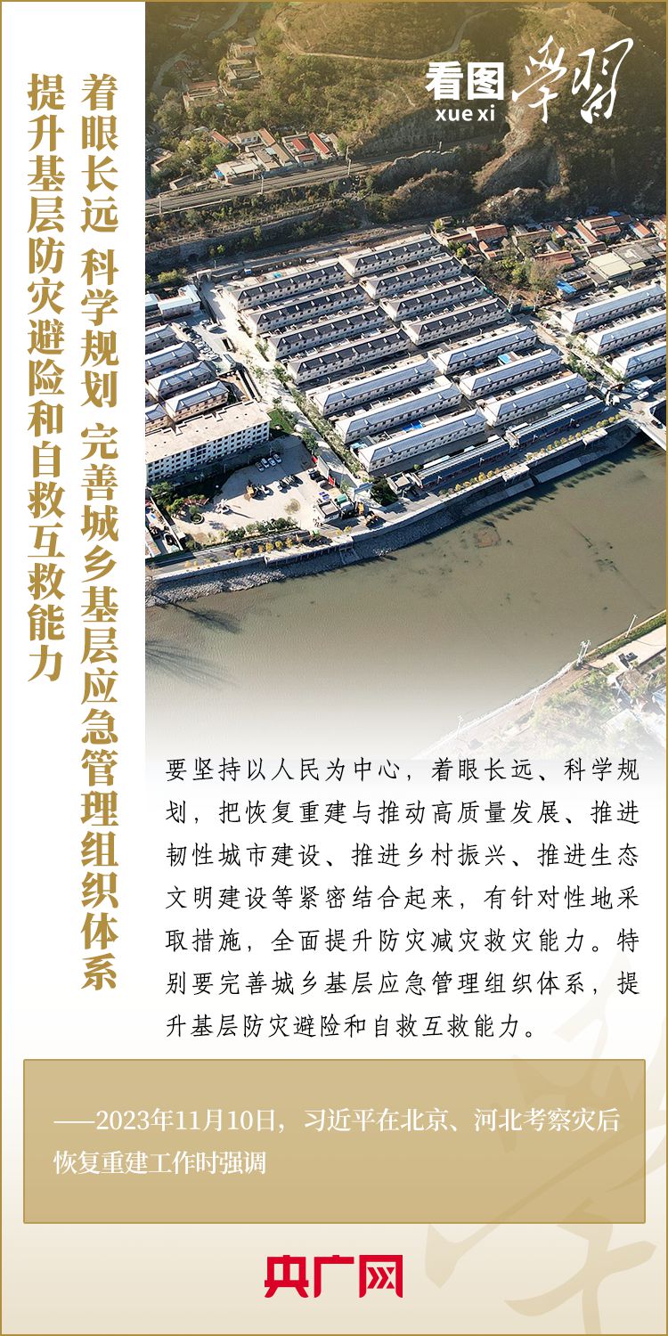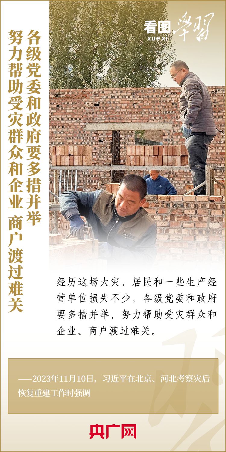 11月10日,習(xí)近平總書(shū)記在北京、河北考察災(zāi)后恢復(fù)重建工作。總書(shū)記深入學(xué)校、社區(qū)、村莊、水利工程工地,實(shí)地察看村容村貌,了解基礎(chǔ)設(shè)施恢復(fù)建設(shè)提升等情況,要求有關(guān)部門(mén)堅(jiān)持以人民為中心,堅(jiān)持系統(tǒng)觀念,著眼長(zhǎng)遠(yuǎn)、科學(xué)規(guī)劃,把恢復(fù)重建與推動(dòng)高質(zhì)量發(fā)展、推進(jìn)韌性城市建設(shè)、推進(jìn)鄉(xiāng)村振興、推進(jìn)生態(tài)文明建設(shè)等緊密結(jié)合起來(lái),有針對(duì)性地采取措施,再接再厲抓好災(zāi)后恢復(fù)重建,確保廣大人民群眾安居樂(lè)業(yè)、溫暖過(guò)冬。