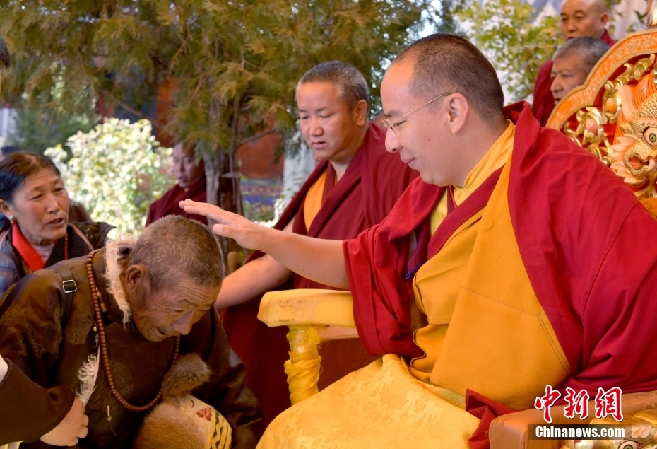 11月13日、14日,全國政協(xié)常委、中國佛教協(xié)會副會長、中國佛教協(xié)會西藏分會會長班禪額爾德尼·確吉杰布在日喀則扎什倫布寺為數萬名信教群眾摸頂賜福。圖為11月13日,班禪為信眾摸頂賜福。