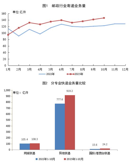 1-10月,同城快遞業(yè)務量累計完成108.3億件,同比增長2.7%;異地快遞業(yè)務量累計完成919.2億件,同比增長18.2%;國際/港澳臺快遞業(yè)務量累計完成24.2億件,同比增長55.1%。