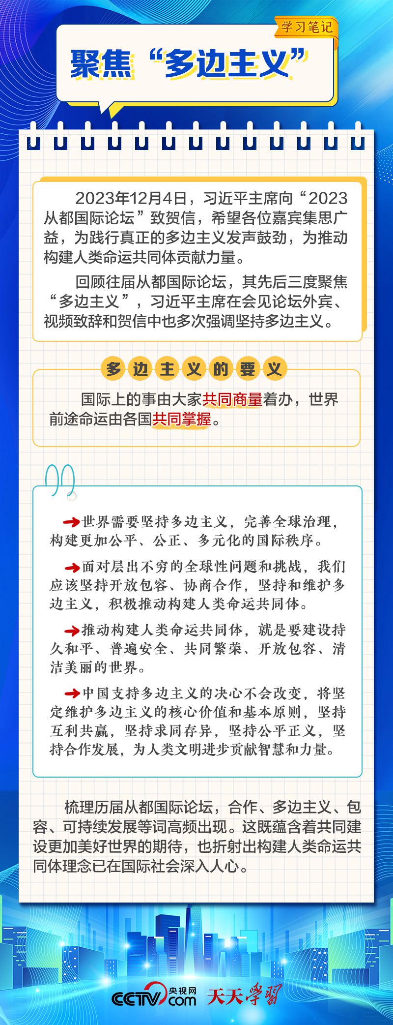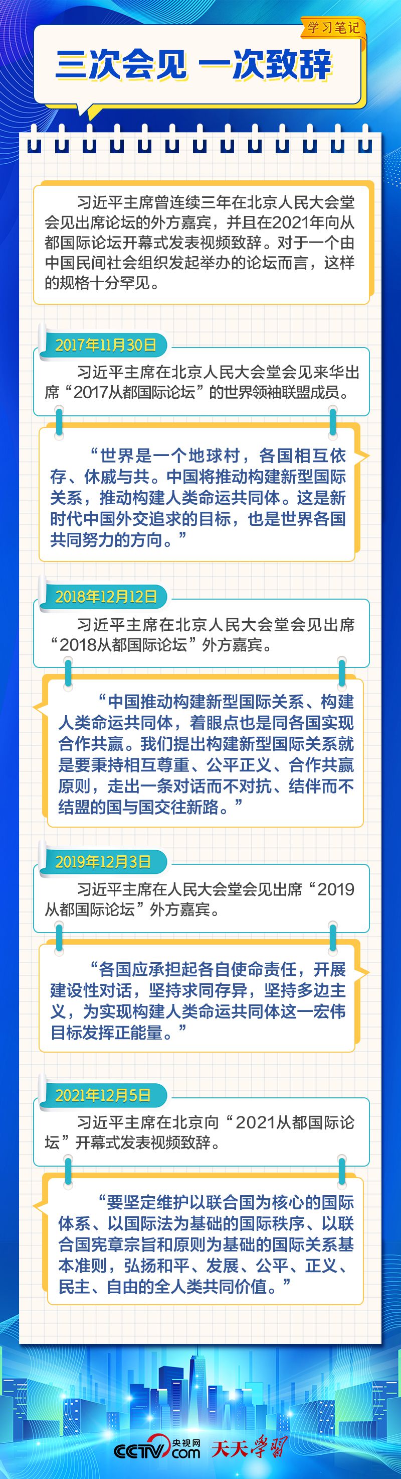 天天學(xué)習(xí) 12月4日,習(xí)近平主席在致“2023從都國(guó)際論壇”的賀信中強(qiáng)調(diào),面對(duì)前所未有的世界之變、時(shí)代之變和歷史之變,人類社會(huì)必須團(tuán)結(jié)起來(lái),堅(jiān)持互學(xué)互鑒、開(kāi)放包容、合作共贏,弘揚(yáng)全人類共同價(jià)值,共同建設(shè)更加美好的世界。