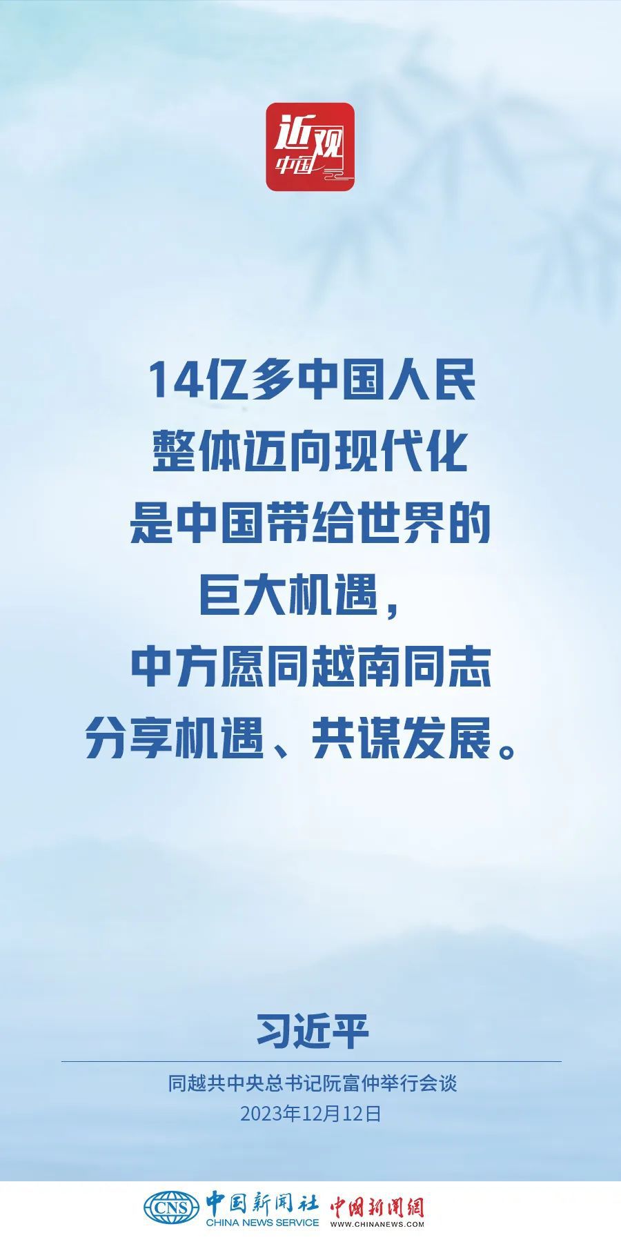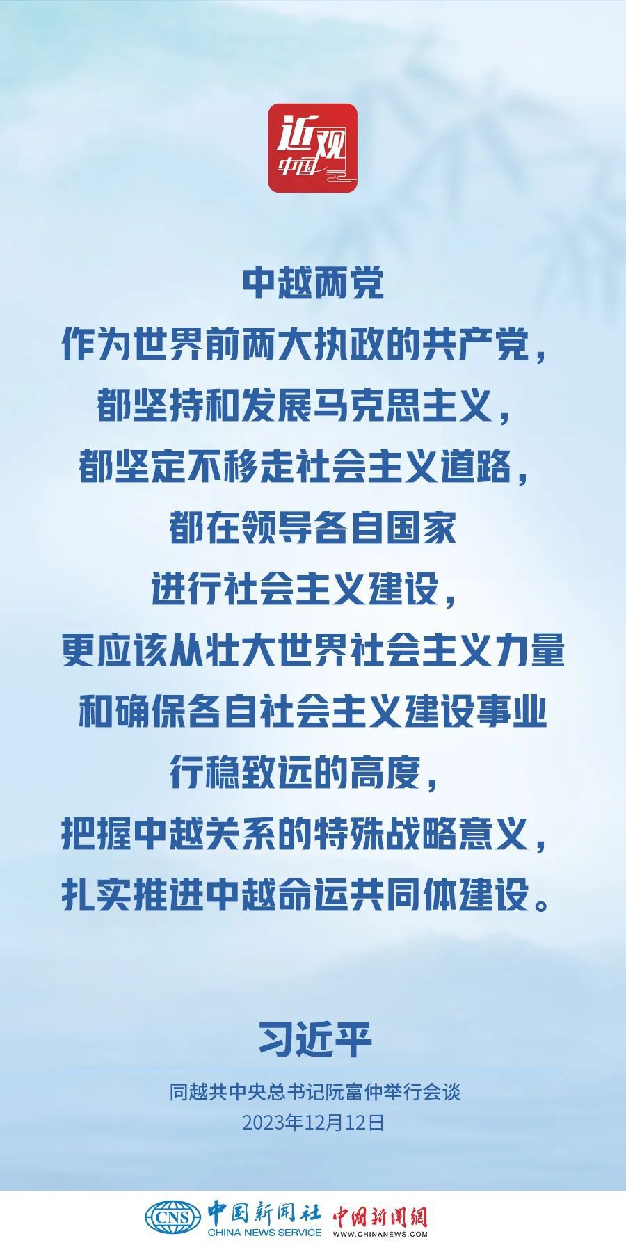 當?shù)貢r間12月12日下午,剛剛抵達河內(nèi)的中共中央總書記、國家主席習近平在越共中央駐地同越共中央總書記阮富仲舉行會談。雙方宣布中越兩黨兩國關系新定位,在深化中越全面戰(zhàn)略合作伙伴關系基礎上,攜手構建具有戰(zhàn)略意義的中越命運共同體。習近平指出——