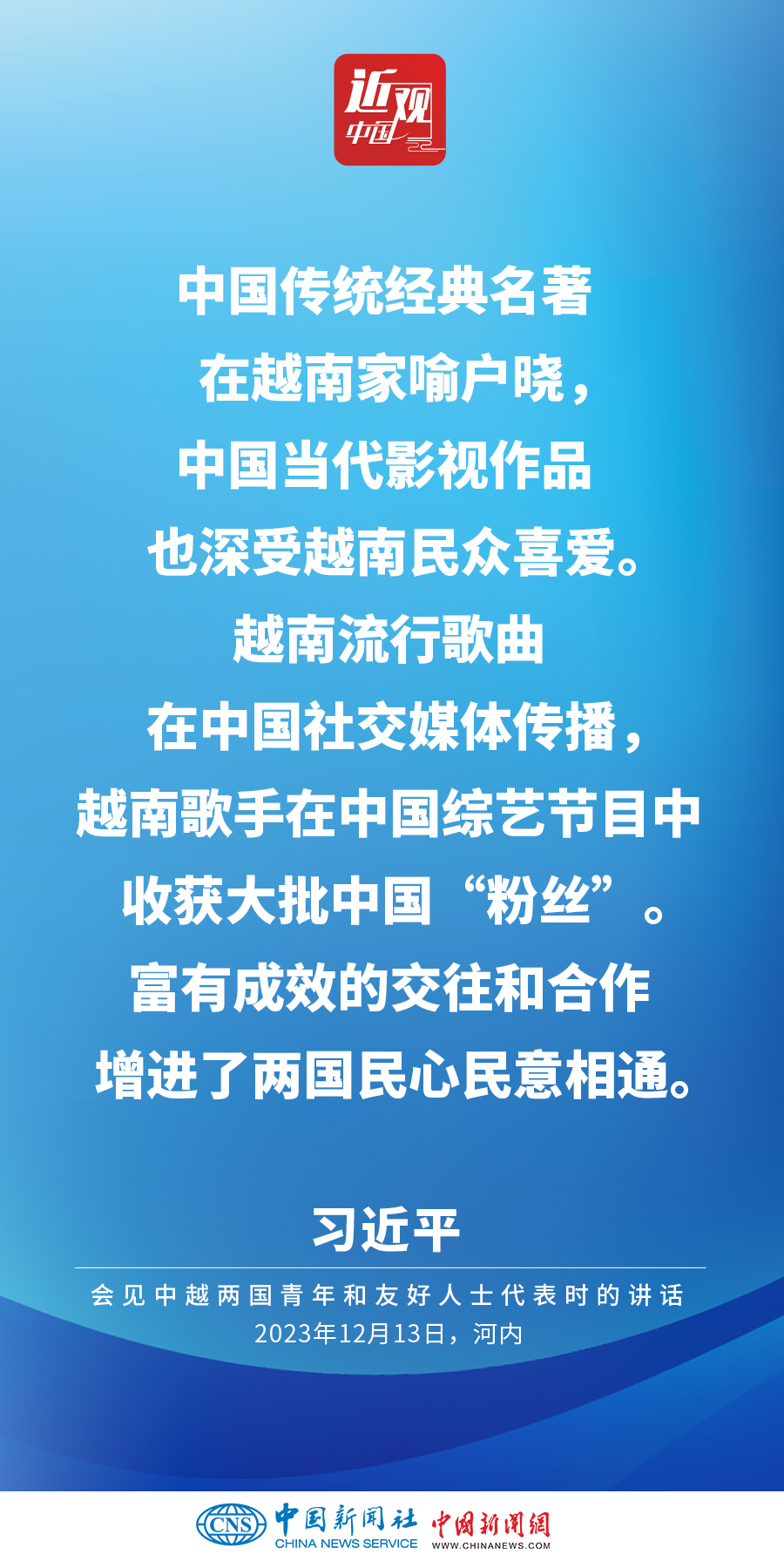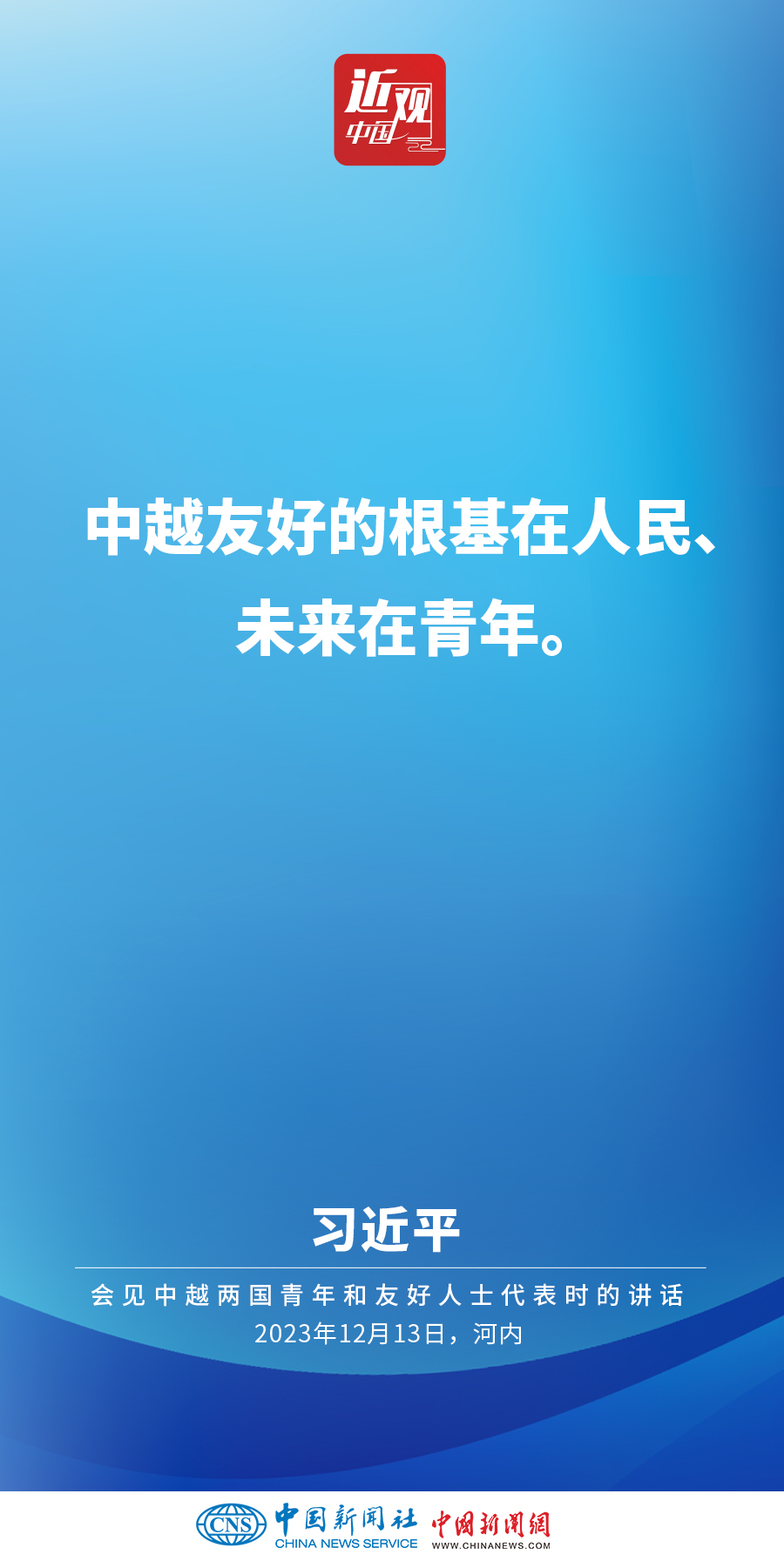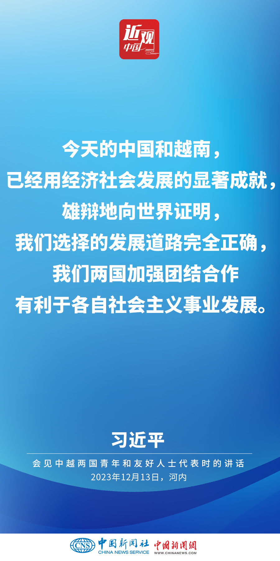 當(dāng)?shù)貢r間12月13日下午,中共中央總書記、國家主席習(xí)近平和夫人彭麗媛在河內(nèi)同越共中央總書記阮富仲夫婦共同會見中越兩國青年和友好人士代表。他在題為《賡續(xù)傳統(tǒng)友誼,開創(chuàng)中越命運(yùn)共同體建設(shè)新征程》的重要講話中指出,展望未來,我們要始終不忘初心,牢記使命,攜手走好各自社會主義道路,讓工業(yè)化現(xiàn)代化建設(shè)成果更多惠及兩國人民,共同為人類進(jìn)步事業(yè)作出更大貢獻(xiàn)。
