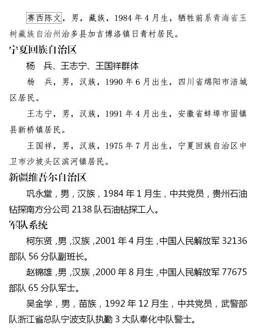 上榜勇士中有勇斗持刀犯罪嫌疑人身負(fù)重傷的張照杰、姚玉龍、王沖、王永芳;有從高橋跳水救人的周中磊、曾文文、周海;有從隨時(shí)可能爆炸的事故車輛中救出司機(jī)母子的湯益鑫;有冒著煤氣罐爆炸危險(xiǎn)制服劫持孩子歹徒的蔡國榮;有救援被困電梯內(nèi)同事而導(dǎo)致左小腿截肢的翟元敏;有休假期間水下連續(xù)救人的現(xiàn)役軍人柯東賢、吳金學(xué)、趙錦雄;更有見義勇為英勇犧牲的李偉倫、張嘉俊、張可可、李峰武、安西德、何同猛、曾維龍、胡喜明、李振華、東周才仁、賽西陳文11位同志。勇士們見義勇為事跡鼓舞人心、振奮精神、催人奮進(jìn)。他們用血汗甚至生命秉承、詮釋了中華民族傳統(tǒng)美德,用奮不顧身的實(shí)際行動(dòng)踐行了社會主義核心價(jià)值觀。