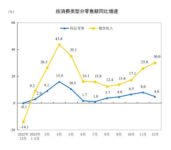 按消費類型分,12月份,商品零售38145億元,同比增長4.8%;餐飲收入5405億元,增長30.0%。2023年,商品零售418605億元,比上年增長5.8%;餐飲收入52890億元,增長20.4%。