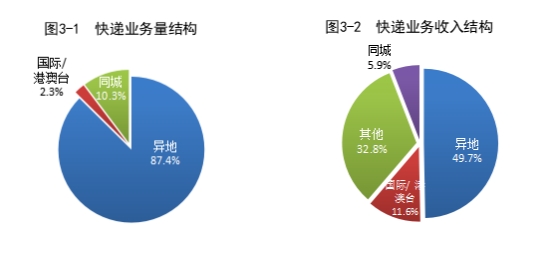 2023年,同城、異地、國際/港澳臺快遞業(yè)務(wù)量分別占全部快遞業(yè)務(wù)量的10.3%、87.4%和2.3%;業(yè)務(wù)收入分別占全部快遞收入的5.9%、49.7%和11.6%。與去年同期相比,同城快遞業(yè)務(wù)量的比重下降1.3個百分點,異地快遞業(yè)務(wù)量的比重上升0.8個百分點,國際/港澳臺業(yè)務(wù)量的比重上升0.5個百分點。