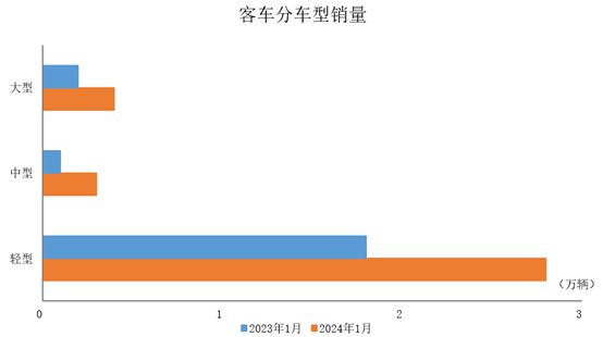 2024年1月,客車(chē)產(chǎn)銷均完成3.5萬(wàn)輛,環(huán)比分別下降35.3%和36.5%,同比分別增長(zhǎng)68.1%和63.4%。在客車(chē)細(xì)分品種中,與上月相比,三大類客車(chē)品種產(chǎn)銷均呈兩位數(shù)下降;與上年同期相比,三大類客車(chē)品種產(chǎn)銷均呈不同程度增長(zhǎng)。