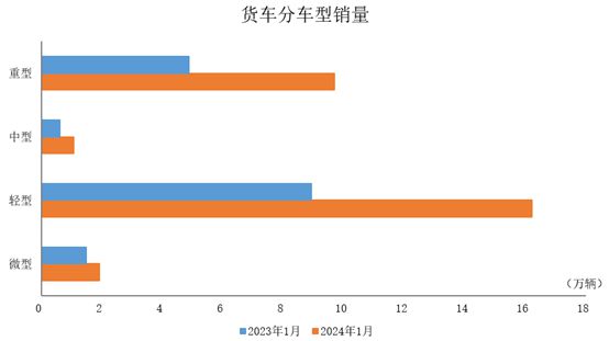 2024年1月,貨車(chē)產(chǎn)銷分別完成29.2萬(wàn)輛和28.9萬(wàn)輛,環(huán)比分別下降6.4%和6.6%,同比分別增長(zhǎng)65.9%和81.8%。在貨車(chē)細(xì)分品種中,與上月相比,重型貨車(chē)和中型貨車(chē)產(chǎn)銷明顯增長(zhǎng),輕型貨車(chē)和微型貨車(chē)產(chǎn)銷呈兩位數(shù)下降;與上年同期相比,四大類貨車(chē)品種產(chǎn)銷均呈不同程度增長(zhǎng)。