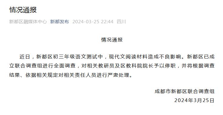 初三語文測試閱讀材料造成不良影響 成都新都發(fā)通報