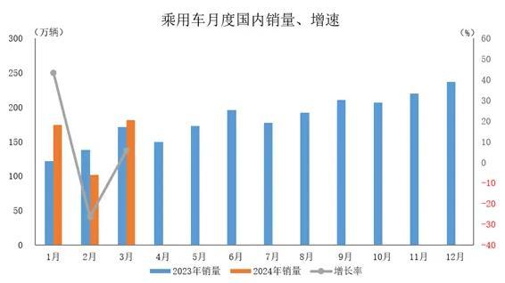 2024年3月,乘用車國內(nèi)銷量181.2萬輛,環(huán)比增長78.1%,同比增長5.8%。