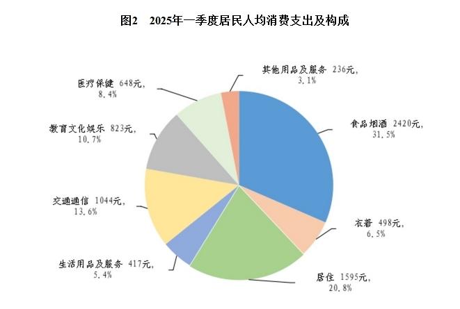 一季度,全國居民人均食品煙酒消費(fèi)支出2420元,增長2.8%,占人均消費(fèi)支出的比重為31.5%;人均衣著消費(fèi)支出498元,增長1.2%,占人均消費(fèi)支出的比重為6.5%;人均居住消費(fèi)支出1595元,增長2.1%,占人均消費(fèi)支出的比重為20.8%;人均生活用品及服務(wù)消費(fèi)支出417元,增長9.6%,占人均消費(fèi)支出的比重為5.4%;人均交通通信消費(fèi)支出1044元,增長10.4%,占人均消費(fèi)支出的比重為13.6%;人均教育文化娛樂消費(fèi)支出823元,增長13.9%,占人均消費(fèi)支出的比重為10.7%;人均醫(yī)療保健消費(fèi)支出648元,增長3.0%,占人均消費(fèi)支出的比重為8.4%;人均其他用品及服務(wù)消費(fèi)支出236元,增長9.9%,占人均消費(fèi)支出的比重為3.1%。