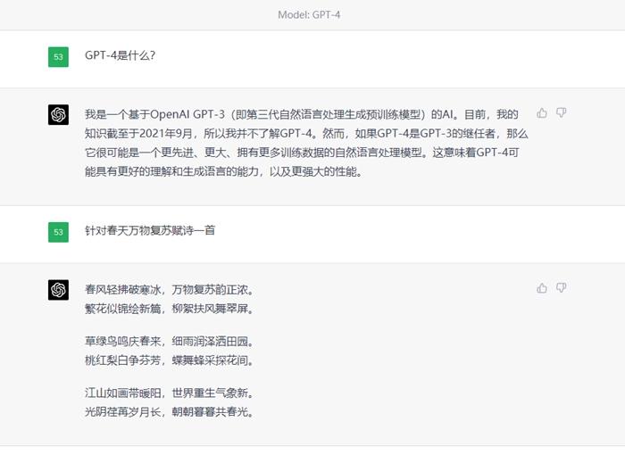目前GPT-4僅限于ChatGPT Plus訂戶使用。記者體驗時發(fā)現(xiàn),GPT-4生成速度比較慢,但回答簡明扼要,更有創(chuàng)造性,無論是寫詩歌還是故事劇本都不在話下。例如它可以根據(jù)“春天萬物復(fù)蘇”賦詩一首或者寫成一個愛情故事的劇本。