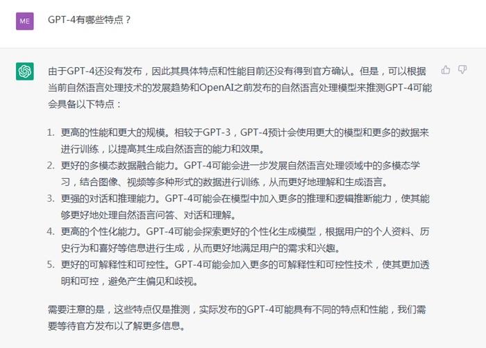 有意思的是,在GPT-4發(fā)布后,再去問ChatGPT和GPT-4“什么是GPT-4”,ChatGPT回答:GPT-4是OpenAI公司計劃開發(fā)的下一代自然語言處理模型,由于GPT-4還沒有發(fā)布,因此其具體特點和性能目前還沒有得到官方確認。