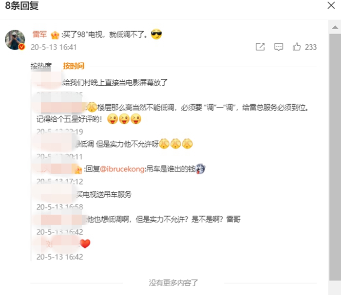 2020年,購買98英寸Redmi MAX 98的王先生安裝電視時動用了吊車,在網絡上引發(fā)關注。當時小米之家用了相關圖片刊發(fā)了微博,雷軍還評論“買了98"電視,就低調不了”。