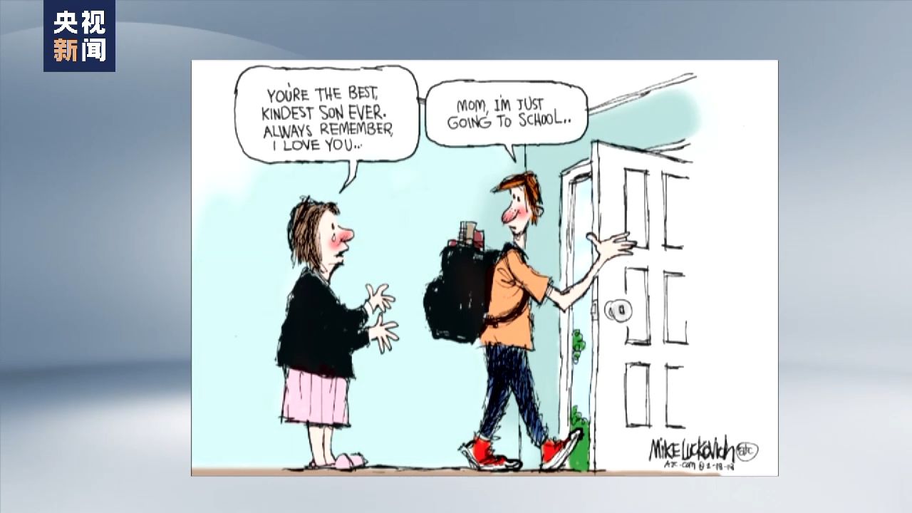 槍支暴力已經(jīng)成為美國(guó)孩子的“頭號(hào)殺手”。在這幅漫畫(huà)中,母親流著眼淚,對(duì)準(zhǔn)備出門(mén)上學(xué)的孩子叮囑道,“你是最好、最善良的兒子,永遠(yuǎn)要記得這一點(diǎn),我愛(ài)你。” 孩子則有點(diǎn)疑惑地說(shuō),“媽媽,我只是去學(xué)校?!?這就是校園槍擊案頻發(fā)令無(wú)數(shù)父母終日膽戰(zhàn)心驚的真實(shí)寫(xiě)照。