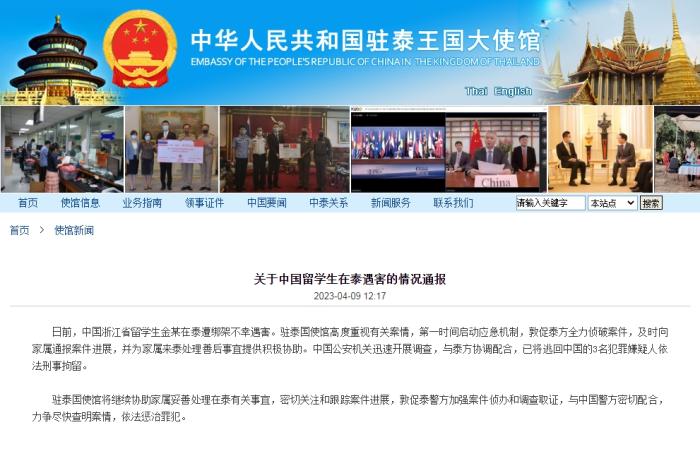 日前,中國(guó)浙江省留學(xué)生金某在泰遭綁架不幸遇害。駐泰國(guó)使館高度重視有關(guān)案情,第一時(shí)間啟動(dòng)應(yīng)急機(jī)制,敦促泰方全力偵破案件,及時(shí)向家屬通報(bào)案件進(jìn)展,并為家屬來泰處理善后事宜提供積極協(xié)助。中國(guó)公安機(jī)關(guān)迅速開展調(diào)查,與泰方協(xié)調(diào)配合,已將逃回中國(guó)的3名犯罪嫌疑人依法刑事拘留。