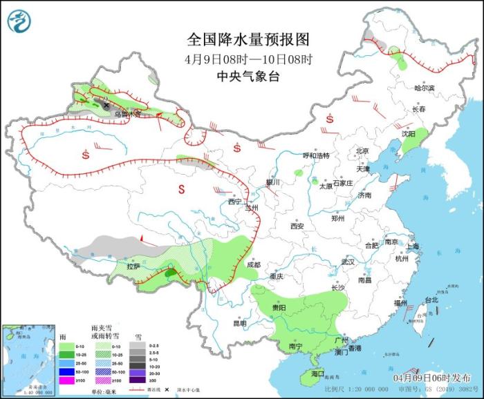 4月9日08時至10日08時,新疆沿天山地區(qū)、西藏南部和東部、甘肅河西、川西高原北部、內(nèi)蒙古東北部等地部分地區(qū)有小到中雪或雨夾雪,其中,新疆天山山區(qū)的高海拔地區(qū)有中到大雪(5~9毫米)。西藏東南部、四川盆地西部、貴州中南部、湖南南部、廣西大部、廣東西部、海南島大部、遼寧東部等地部分地區(qū)有小雨,其中,新疆伊犁河谷、西藏東南部等地部分地區(qū)有中雨。內(nèi)蒙古中西部、新疆南疆盆地、西北地區(qū)北部、遼寧西部、山東半島等地部分地區(qū)有4~6級風(fēng),其中,內(nèi)蒙古西北部部分地區(qū)有6~7級風(fēng),新疆東部、西藏中部等地部分地區(qū)有7~8級風(fēng)。臺灣海峽、南海北部和中部、巴士海峽將有6~7級、陣風(fēng)8級的東北風(fēng)。