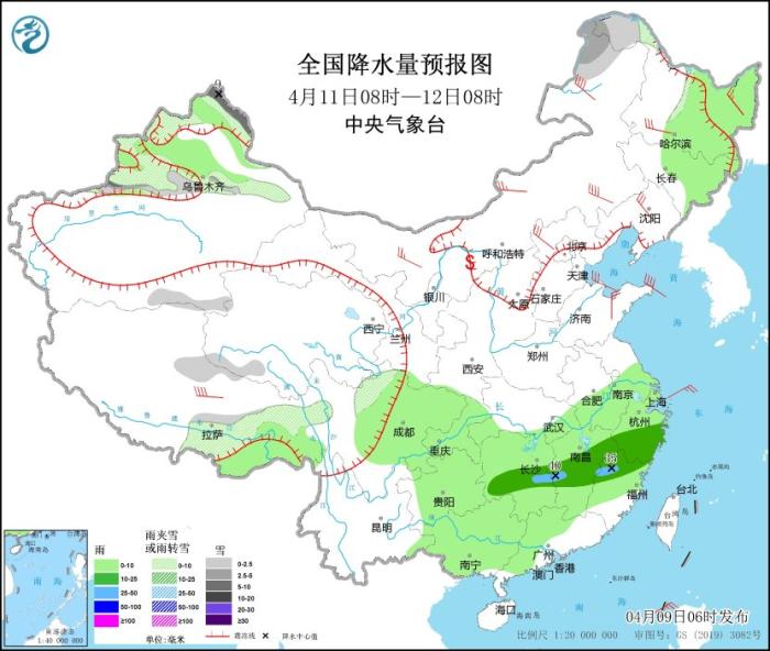 4月11日08時至12日08時,新疆北疆北部和沿天山地區(qū)、內(nèi)蒙古東北部、黑龍江西北部、西藏東部和南部、青海西部、川西高原北部等地部分地區(qū)有小到中雪或雨夾雪,其中,新疆阿勒泰北部等地部分地區(qū)有中到大雪(5~9毫米)。東北地區(qū)東部、西藏東南部、西南地區(qū)東部、江淮大部、江南、華南西部和北部等地部分地區(qū)有小到中雨,其中,湖南中部、江西中部、福建西北部等地部分地區(qū)有大雨(25~40毫米)。內(nèi)蒙古中東部、東北地區(qū)大部、華北東北部、山東半島等地部分地區(qū)有4~6級風(fēng),其中,內(nèi)蒙古東部、西藏中部等地部分地區(qū)有6~7級風(fēng)。