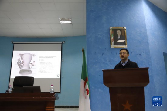 3月7日,在阿爾及利亞塞提夫婦幼醫(yī)院,中國援阿醫(yī)療隊醫(yī)生朱濤為當?shù)刈≡横t(yī)師、醫(yī)學院學生等做講座。新華社發(fā)(中國援阿醫(yī)療隊供圖)