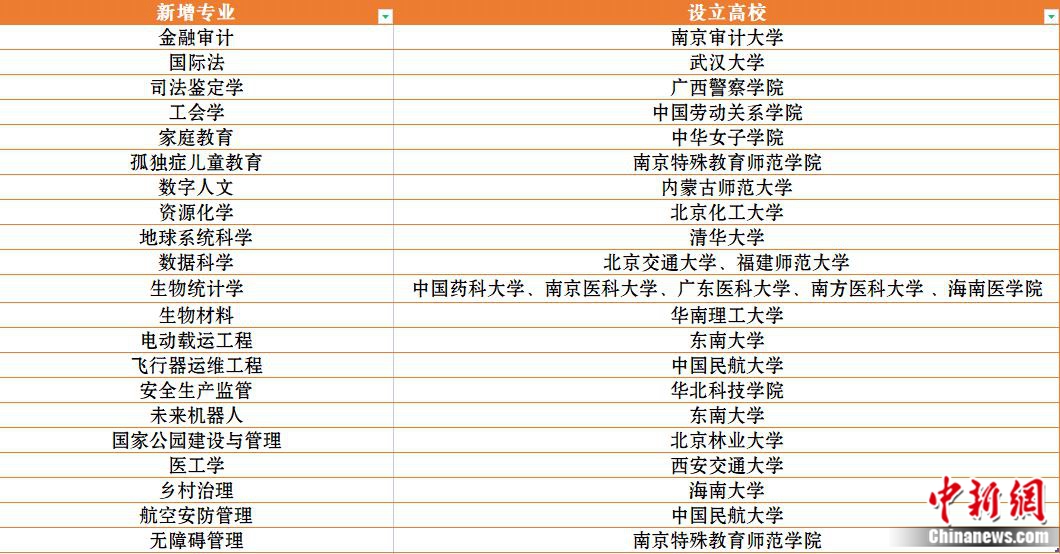 記者梳理發(fā)現(xiàn),21種新專業(yè)涉及10大類(lèi),包括金融審計(jì)、國(guó)際法、司法鑒定學(xué)、工會(huì)學(xué)、家庭教育、孤獨(dú)癥兒童教育、數(shù)字人文、資源化學(xué)、地球系統(tǒng)科學(xué)、數(shù)據(jù)科學(xué)、生物統(tǒng)計(jì)學(xué)、生物材料、電動(dòng)載運(yùn)工程、飛行器運(yùn)維工程、安全生產(chǎn)監(jiān)管、未來(lái)機(jī)器人、國(guó)家公園建設(shè)與管理、醫(yī)工學(xué)、鄉(xiāng)村治理、航空安防管理、無(wú)障礙管理。