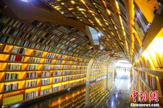 資料圖:河南省鄭州市,一所高校在圖書(shū)館內(nèi)打造了一條近百米長(zhǎng)的“書(shū)海隧道”。