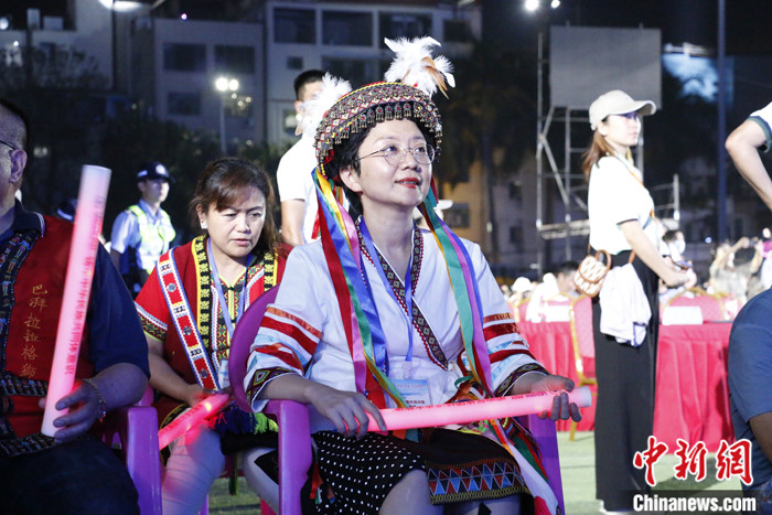 圖為4月22日晚,海南省臺(tái)聯(lián)副會(huì)長(zhǎng)劉芳穎身著臺(tái)灣少數(shù)民族服飾出席在樂(lè)東舉行的“三月三”開幕活動(dòng)。 中新社記者 朱賀 攝